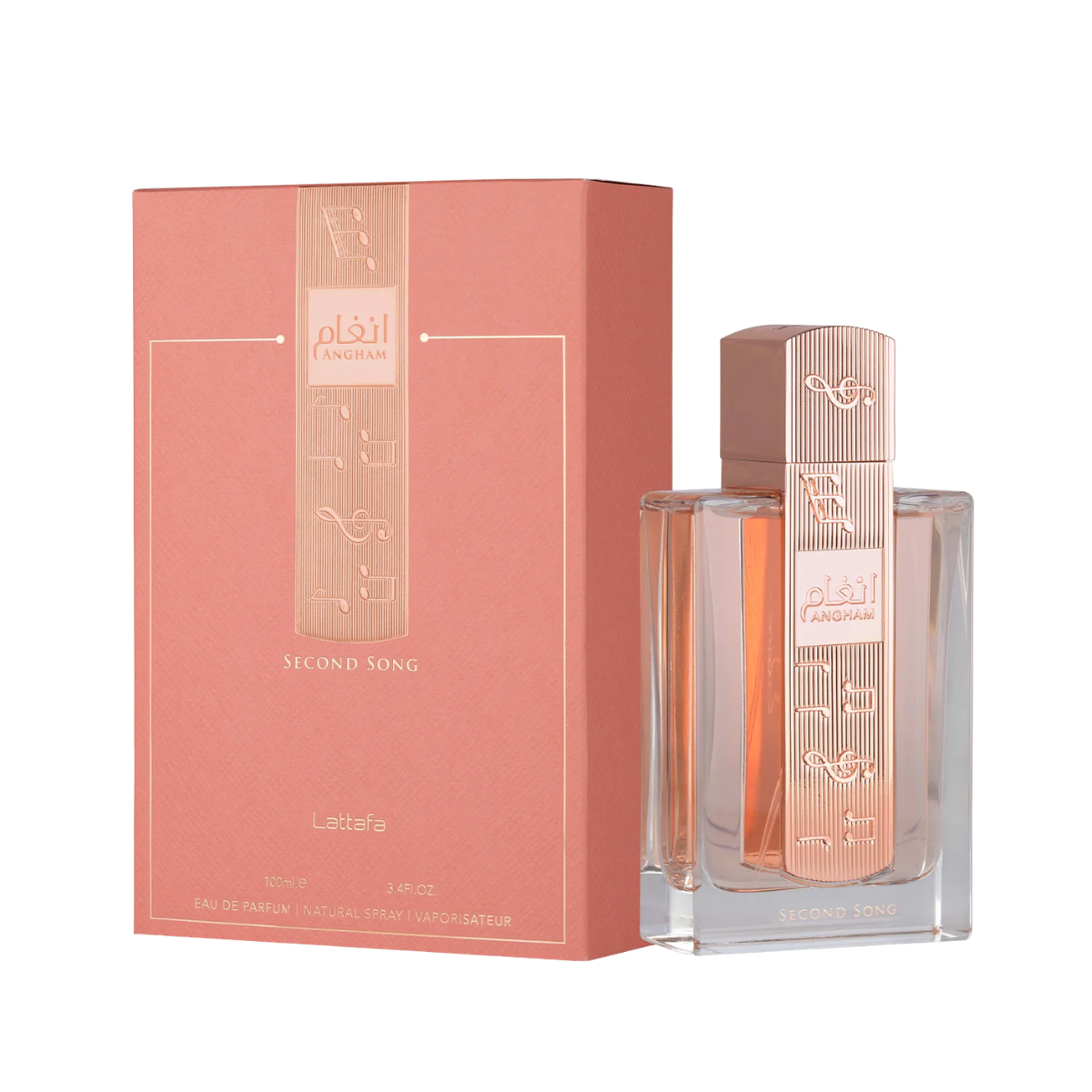 Angham Second Song de Lattafa Perfumes é um perfume Floral Frutado Gourmand Feminino. Esta é uma nova fragrância. Angham Second Song foi lançado em 2026. As notas de topo são: Flor de Pêra e Bergamota. As notas de coração são: Peônia, Flor de Laranjeira e Pralinê. As notas de fundo são: Baunilha, Almíscar, Fava Tonka e Ambroxan.