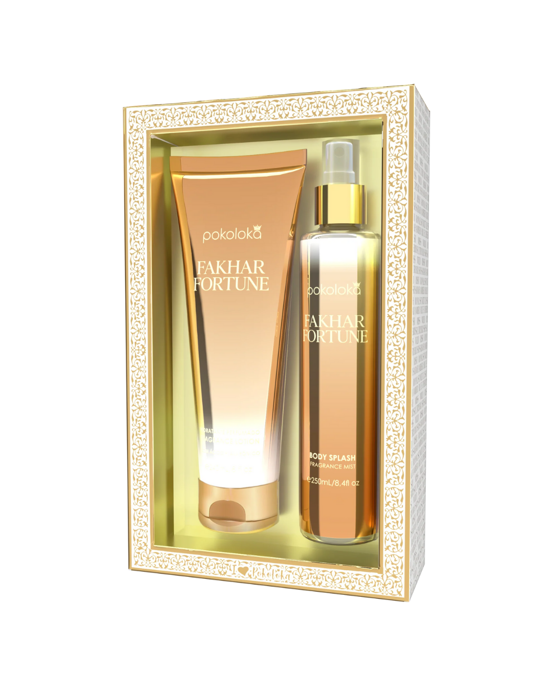 Inspirado na exuberante fragrância Fakhar Rose, da Lattafa Perfumes, o Kit Luxury Fakhar Fortune combina hidratação intensa e perfumação encantadora, proporcionando uma experiência envolvente e sensual. Composto pelo Hidratante Perfumado Fakhar Fortune (240ml) e pelo Body Splash Fakhar Fortune (250ml), esse kit deixa a pele macia, hidratada e com um perfume floral que exala frescor e doçura.