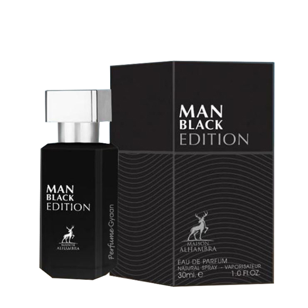 Man Black Edition de Maison Alhambra é um perfume Amadeirado Aromático Masculino. Man Black Edition foi lançada em 2022. As notas de topo são: Violeta, Laranja, Pimenta Rosa e Noz-moscada. As notas de coração são: Notas Terrosas, Jasmim, Notas Doces, Papiro e Patchouli. As notas de fundo são: Incenso, Cedro, Almíscar, Fava Tonka e Tabaco.
